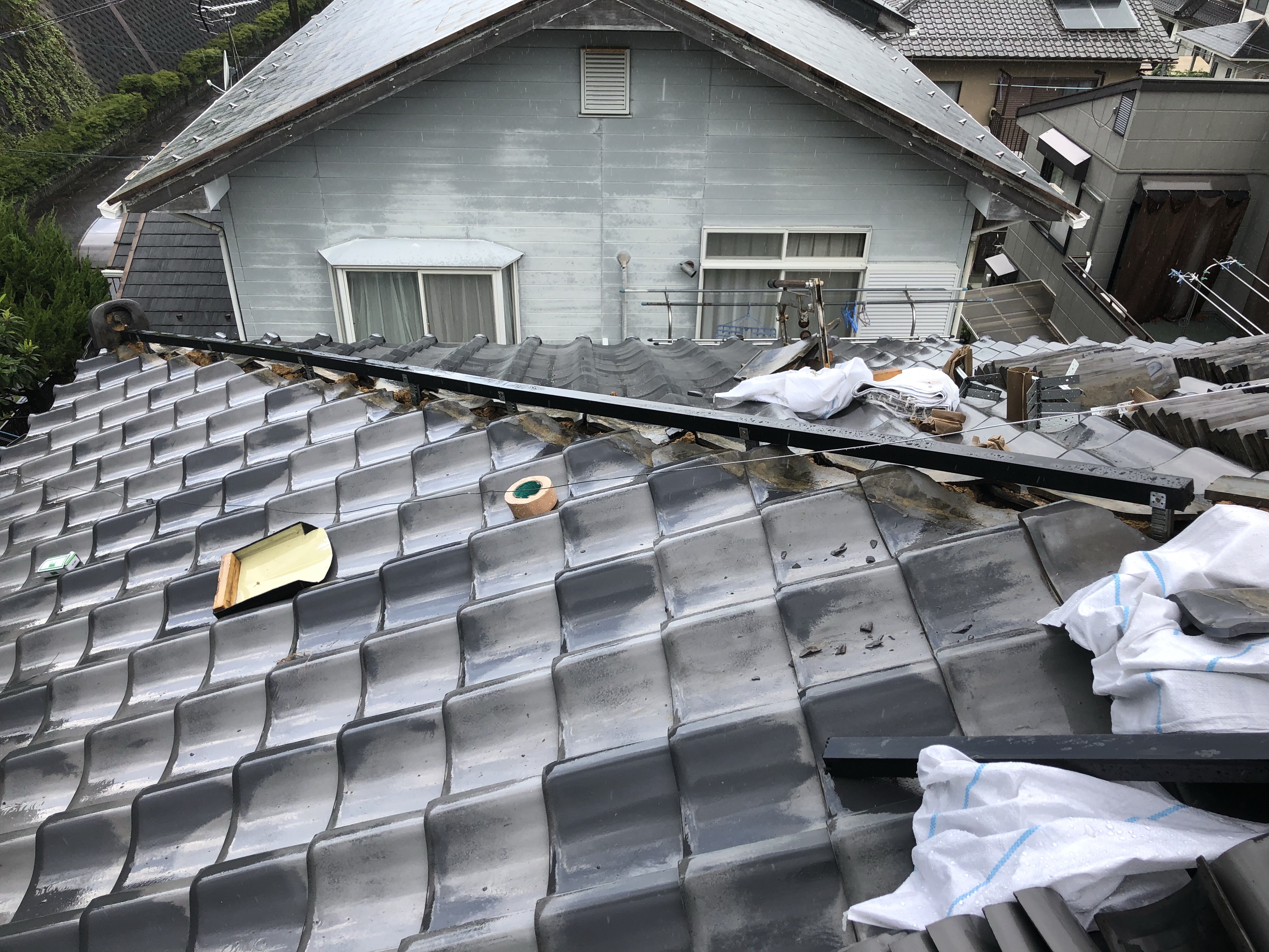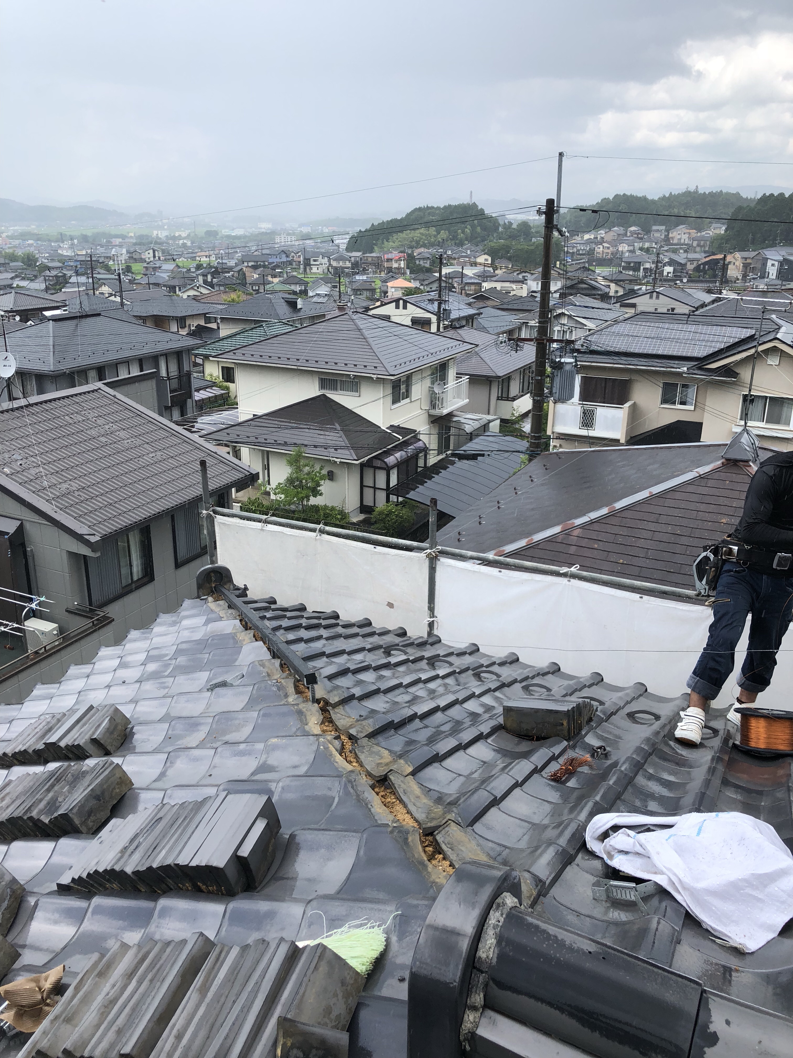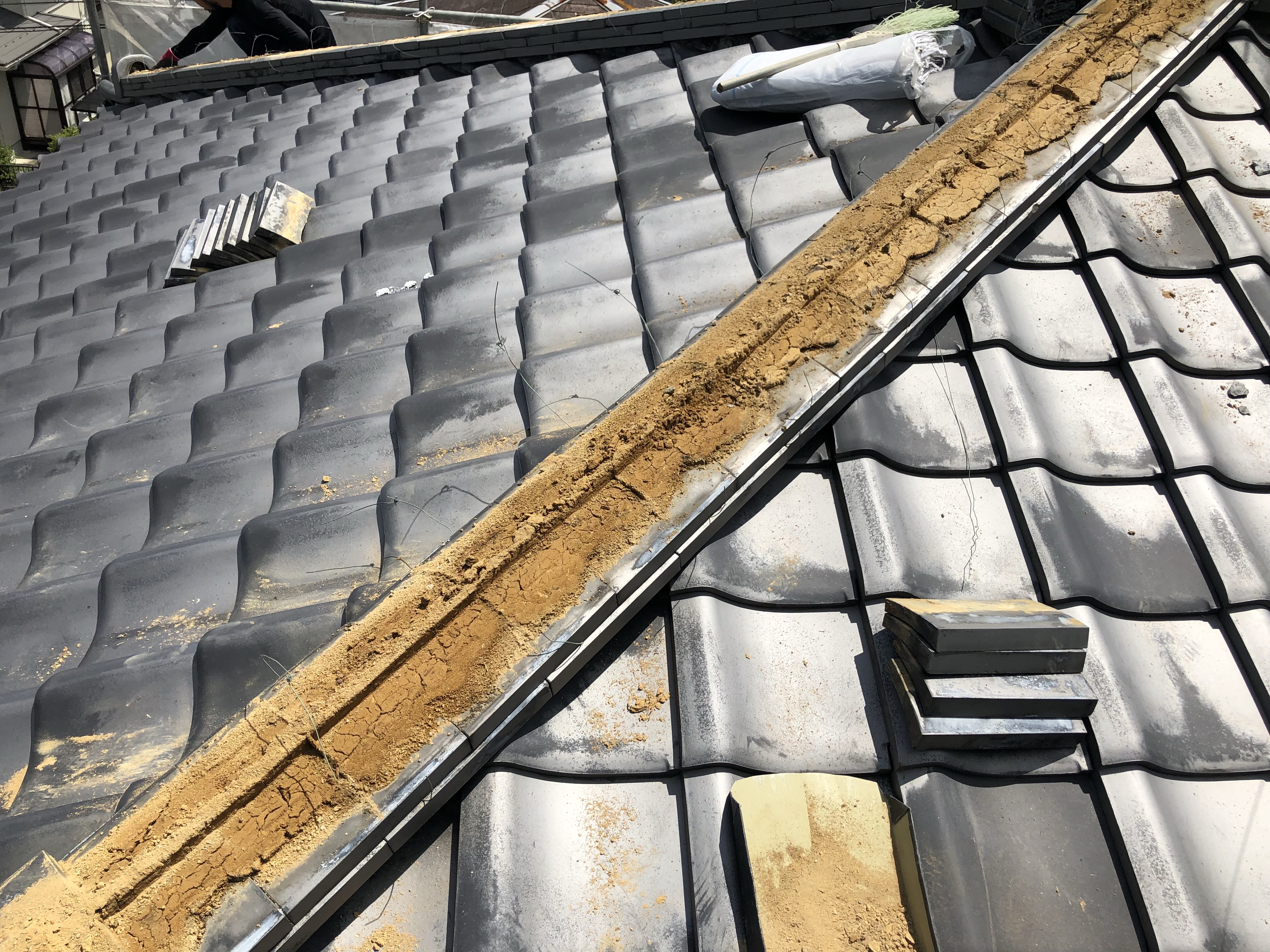 本日は二階上屋から着工、隅棟瓦を一段一段解体していきながら、内部症状を見落とさずにチェックしていきます。この時ばかりは内科のお医者さんの心境です。