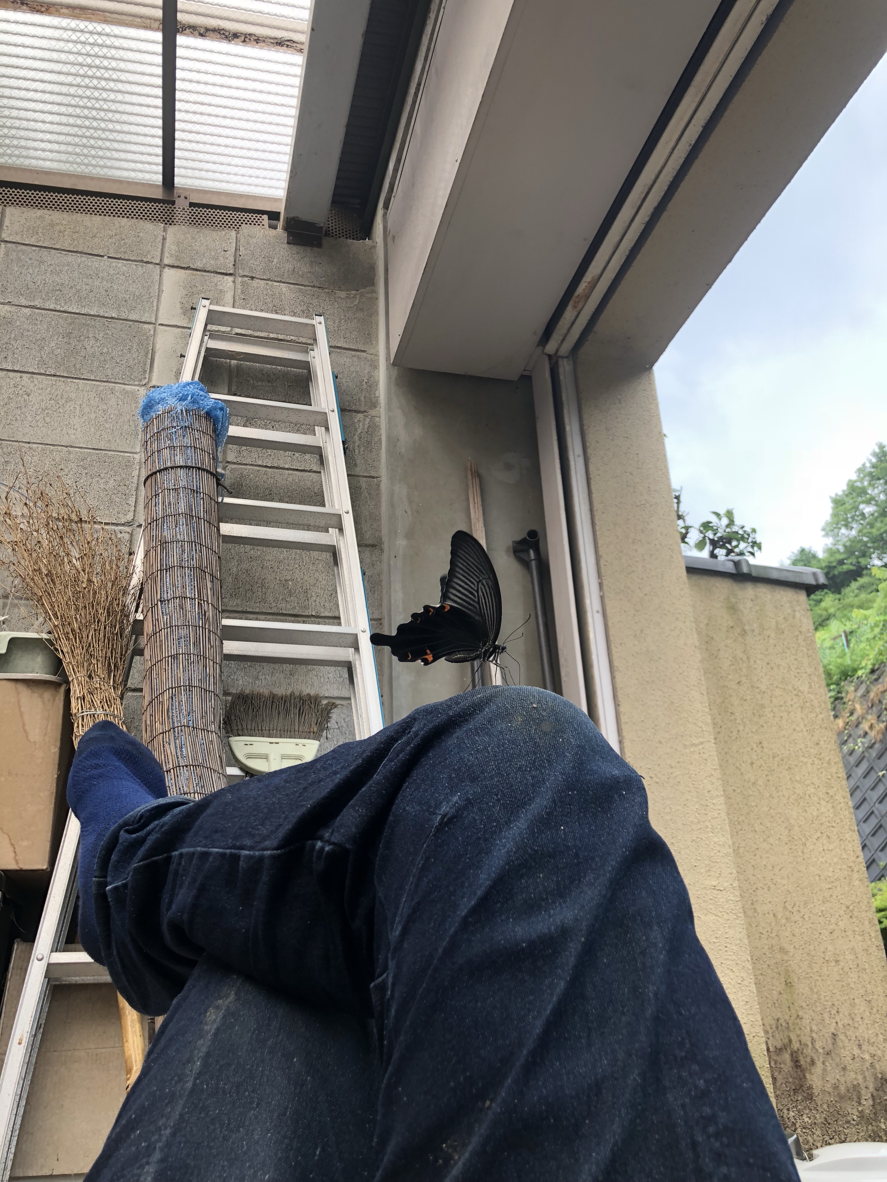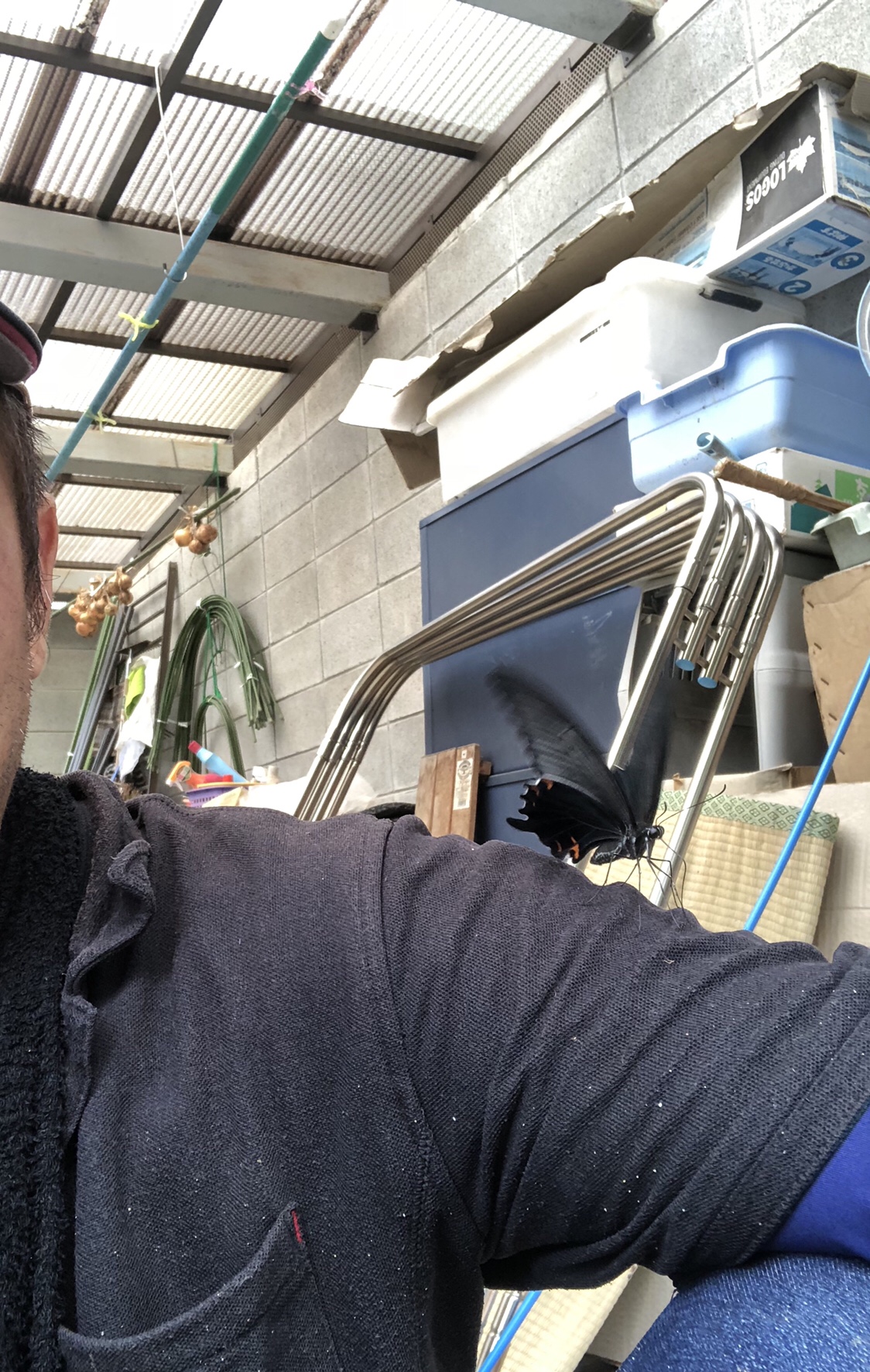雨をやり過ごすのに、お客様のガレージで休憩をいただいていたら、何処からともなく蝶々が?